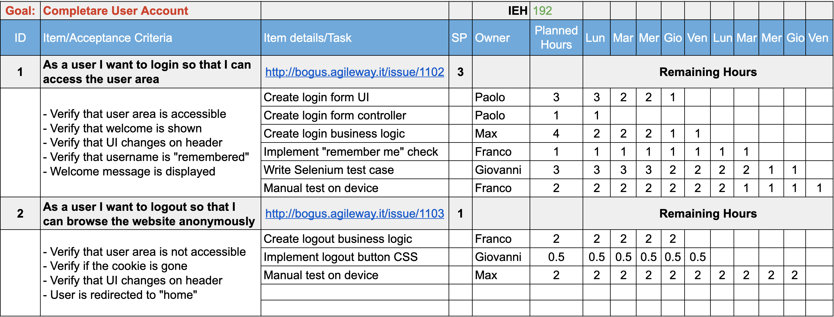 Un organizzazione simile crea solo confusione, perché chi si trova a dover aggiornare le ore, sopratutto se sta realizzando storie condivise da piu componenti del team di sviluppo, non ha idea di cosa aggiornare e cosa è stato aggiornato. Si risolve creando una colonna “nome sviluppatore” e duplicando le righe dei task (qualora condivisi) per il numero dei partecipanti allo sviluppo dello stesso.